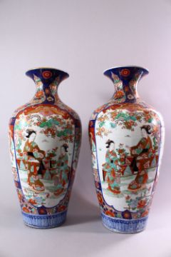 A LARGE PAIR OF JAPANESE MEIJI PERIOD IMARI PORCELAIN VASES, with panel decoration depicting figures stood in landscapes, with butterflies and native flora, with decoration of phoenix, and typical imari surrounding decoration, 61cm high