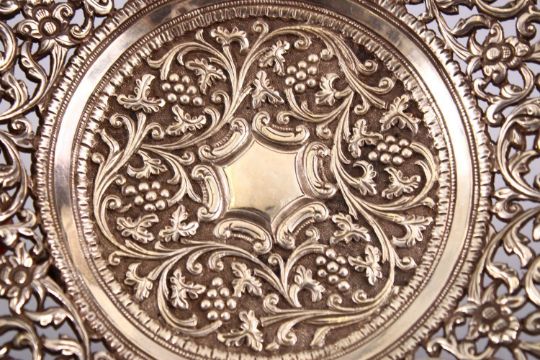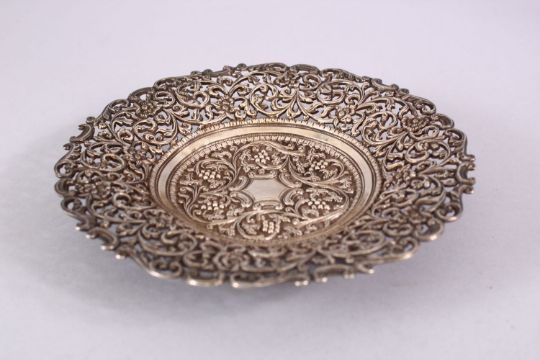 A 19TH CENTURY INDIAN SILVER OPEN WORKED DISH, with formal floral decoration and openwork, 18cm.
