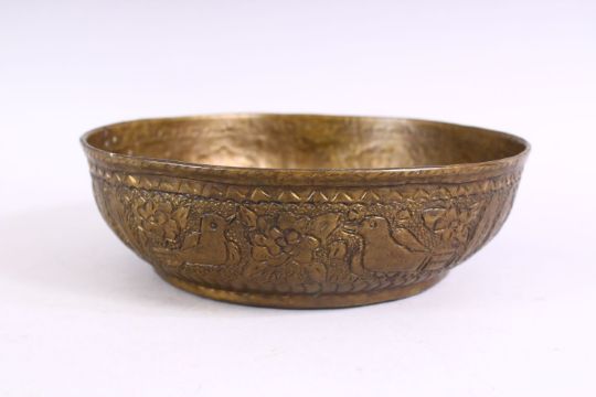 A GOOD EARLY 20TH CENTURY OVAL TRAY embossed with lions, figures and birds, 39cm wide. Together with an embossed brass bowl, a cast brass bowl and a hand mirror.