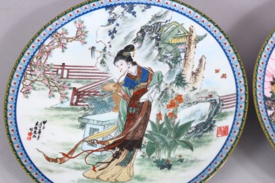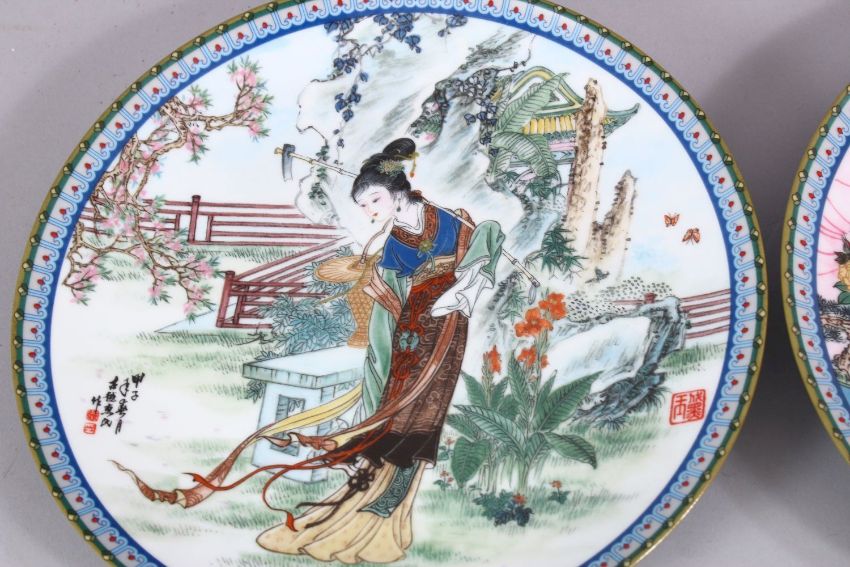 A SET OF SIX CHINESE FAMILLE ROSE PORCELAIN PLATES, each with a different view of a female figure interior, with calligraphy and seals, the back with calligraphy also, 21.5cm