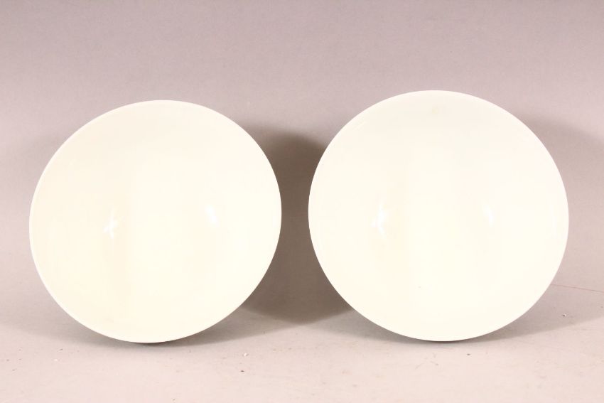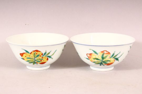 A GOOD QUALITY PAIR OF CHINESE FAMILLE ROSE PORCELAIN PEACH BOWLS, the body of the bowls with decoration depicting fruit and vine decoration, the base of the bowl with a six character Yongzheng mark, 15cm diameter