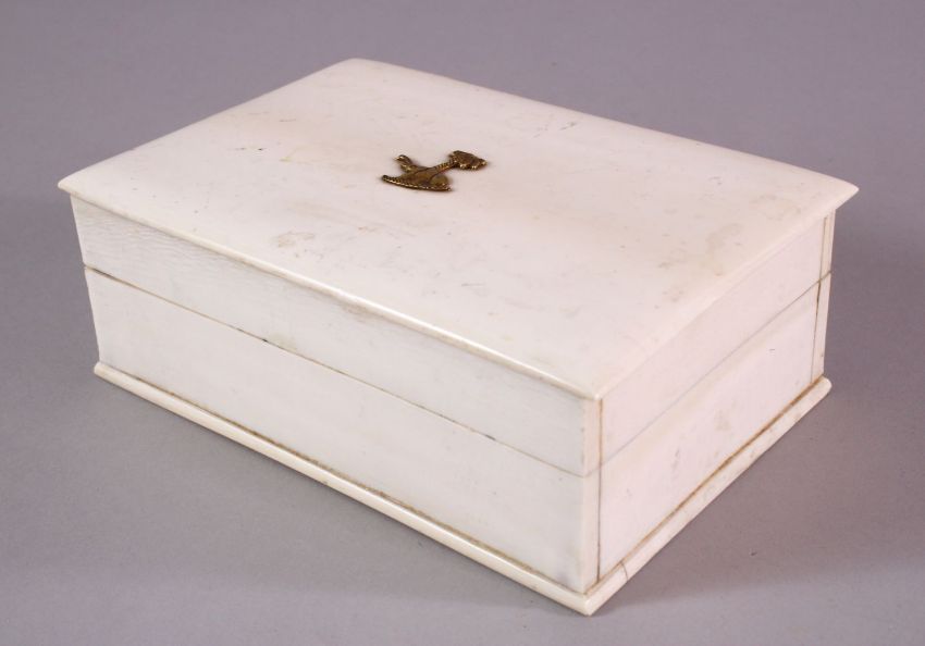 A 19TH CENTURY INDIAN IVORY LIDDED BOX - with an on laid gilt metal elephant, 15.5cm x 11cm