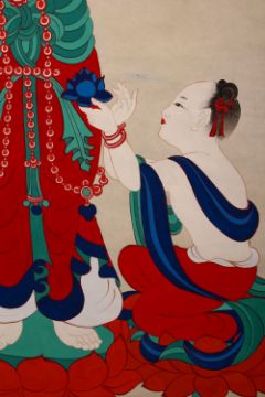A GOOD 20TH CENTURY CHINESE SCROLL PAINTING, painted with a standing female deity, an attendant kneeling by her side, signed with red seal marks, 130cm x 65cm.
