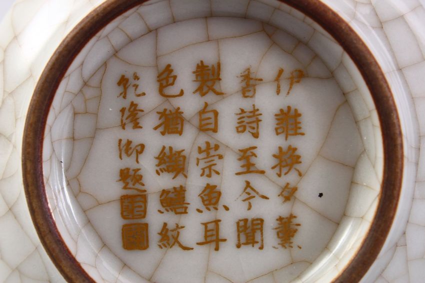 A CHINESE GE WARE PORCELAIN VASE WITH CALLIGRAPHY, The vase with a triple opening to the top, the base with gilded calligraphy, 9cm.