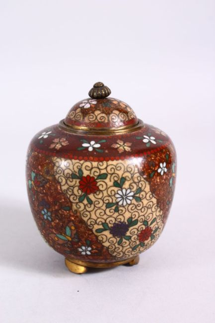 A 19TH CENTURY JAPANESE CLOISONNE POT & COVER, with gold speck decoration with flora upon multi colour ground, 9.5cm high.