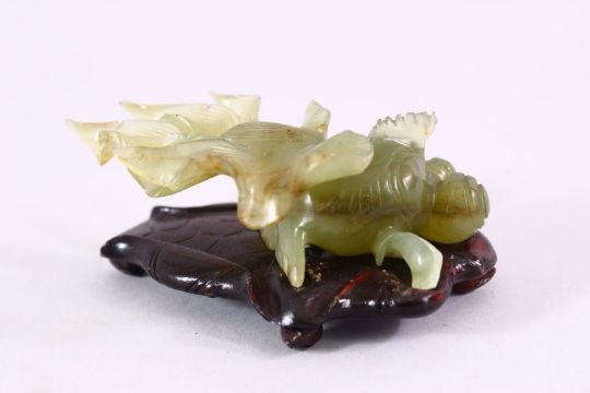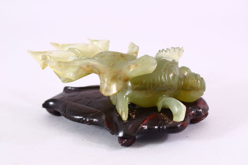 A CHINESE CARVED JADE FIGURE OF A GOLDFISH, on a carved wooden base, 10cm.