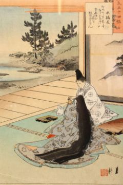 A GOOD JAPANESE MEIJI PERIOD SIGNED FRAMED WOOD BLOCK PRINT - BY GEKKOU, depicting two seated figures aside a landscape, signed with a seal, and series, framed 52cm x 37cm.