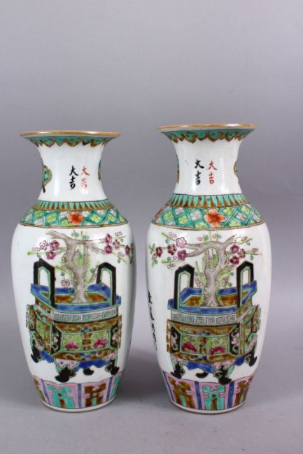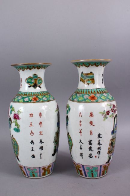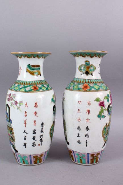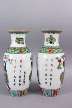 A PAIR OF CHINESE REPUBLIC STYLE FAMILLE VERTE PORCELAIN CALLIGRAPHIC VASES, with decoration depicting displays of native flora, with calligraphy between floral borders, the bases with iron red seal marks to base. 28cm.