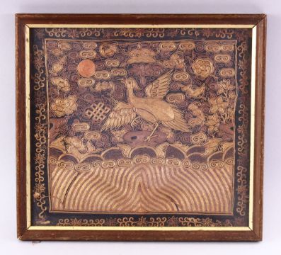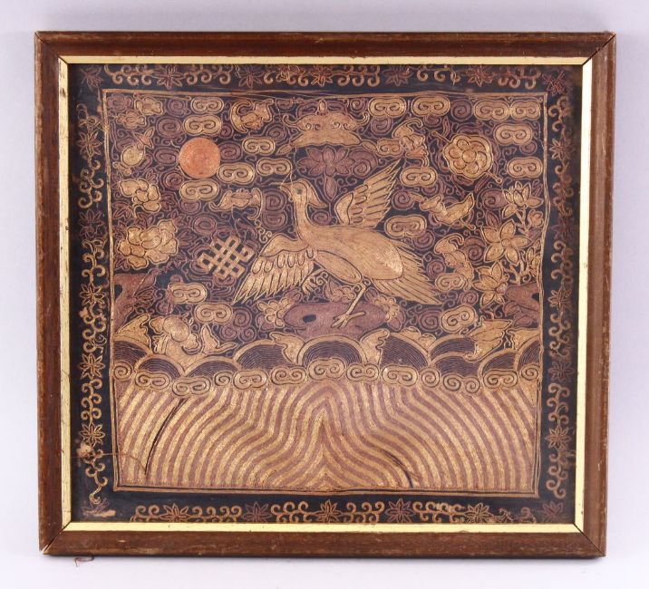 A CHINESE GOLD THREAD EMBROIDERED RANK BADGE, depicting a bird, 31cm x 33cm.