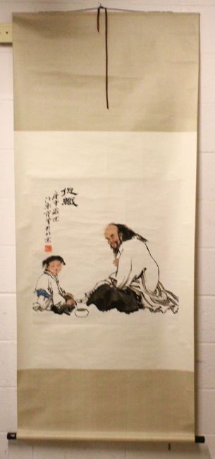 A CHINESE SCROLL PAINTING OF TWO FIGURES - FANG ZENG, depicting two seated figures, signed and sealed for Fang Zeng.