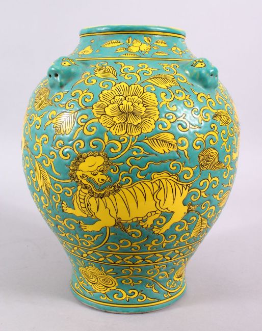 A CHINESE MING STYLE TURQUOISE GROUND PORCELAIN KYLIN VASE, decorated with a turquoise ground with yellow decoration of scrolling flora and kylin, with four moulded handles, the base with a six character mark, 28cm high.