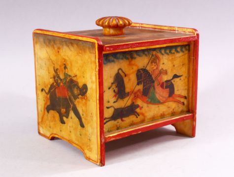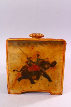 A 19TH CENTURY INDIAN MARBLE BOX, with painted scenes of hunting and floral decoration, 15cm high, 16.5cm wide, 15cm deep.