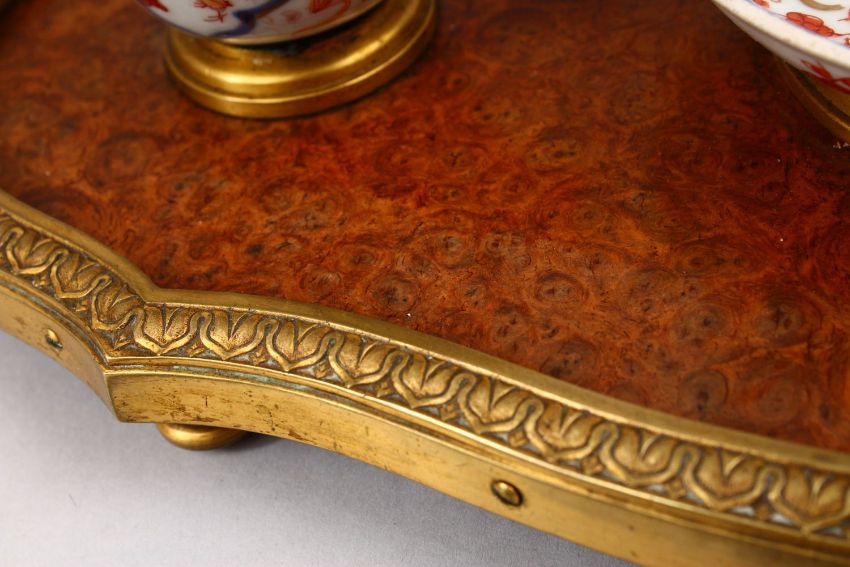 AN 18TH / 19TH CENTURY CHINESE IMARI PORCELAIN DISH AND CUPS - MOUNTED, the two cups and saucer dish mounted to a burr wood gilt mounted base, forming an inkwell or candlestick holder, 35cm long 19cm,