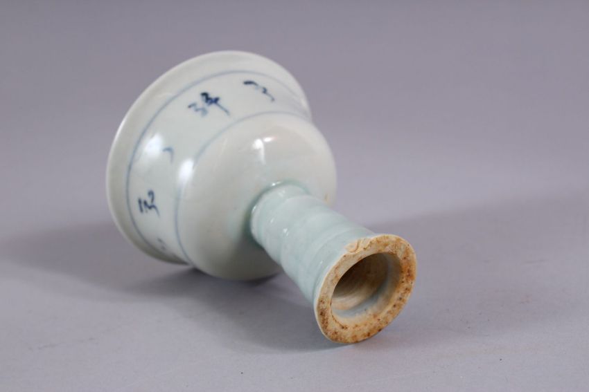 A CHINESE BLUE & WHITE CALLIGRAPHIC PORCELAIN STEM CUP, the body with decoration of calligraphy, 10cm high x 8cm diameter.