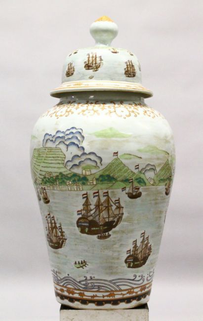 A LARGE 20TH CENTURY CHINESE PORCELAIN LIDDED URN - NAUTICAL EUROPEAN SCENES, the body of the large jar decorated with native nautical European landscape scenes, the lid fixed and the base drilled with a bolt, 89cm high x 48cm wide