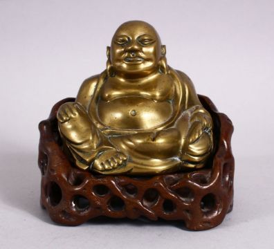 A 19TH CENTURY CHINESE BRONZE FIGURE OF BUDDHA & STAND, seated with his hand upon his knee, in a carved hardwood chair formed stand , 11cm x 11cm.