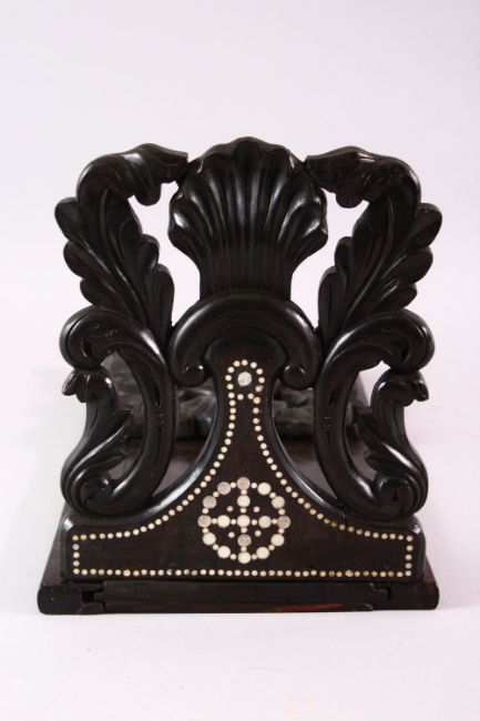 A CEYLONESE EBONY FOLDING BOOK STAND, with carved bone inlaid decoration, 35cm long.
