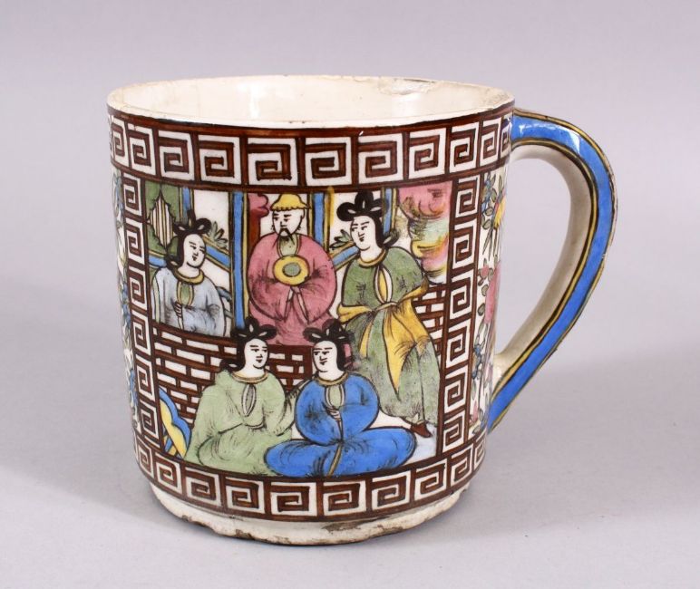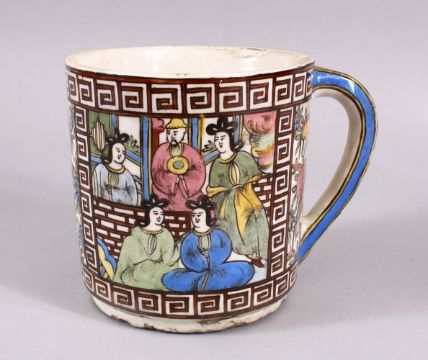 AN UNUSUAL CHINESE STYLE PERSIAN QAJAR LARGE TANKARD, decorated with scenes of figures interior in canton taste, 17th century 13cm high.