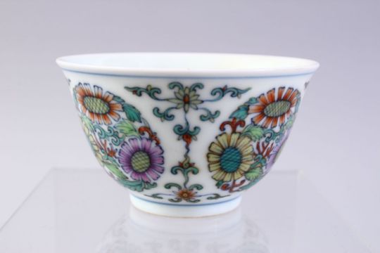 A CHINESE DOUCAI DECORATED CHRYSANTHEMUM PORCELAIN CUP, decorated with roundels of floral displays, the base bearing a six character mark, 8cm.