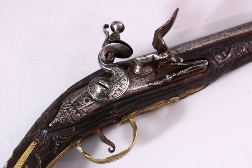 AN 18TH CENTURY ANGLO INDIAN FLINTLOCK PISTOL, with engraved lockplate, carved stock and ornate brass buttcap, 47cm long.