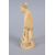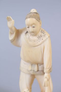 A JAPANESE MEIJI PERIOD CARVED IVORY OKIMONO OF A FISHERMAN, the man stood holding his net, with one hand aloft, to his side a fish is facing up to him, the base artist signed, 15cm high x 5.5cm wide.
