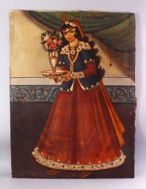 AN EARLY 20TH CENTURY INDIAN SCHOOL FULL LENGTH PORTRAIT OF A WOMAN carrying a dish and vase of flowers, on stretchers - unframed, 100cm x 75cm