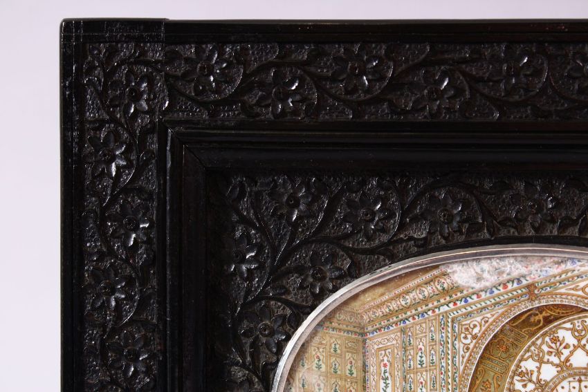 A GOOD LATE 19TH CENTURY INDIAN OVAL MINIATURE PAINTING ON IVORY depicting an architectural interior with gilded highlights in a well carved ebony frame, 25cm wide x 26cm high.