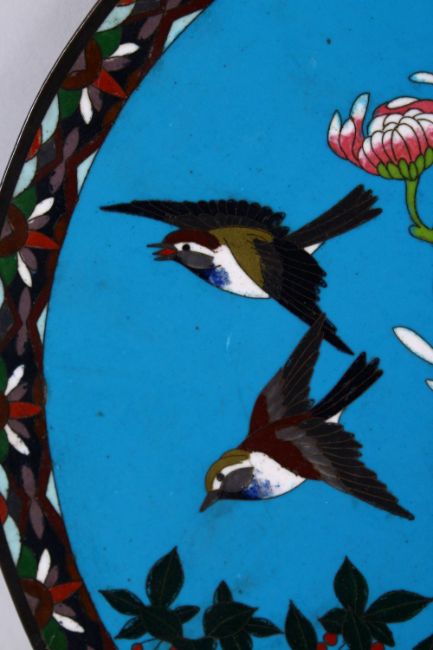 A JAPANESE MEIJI PERIOD CLOISONNE DISH, decorated with scenes of birds amongst native flora, 30.5cm