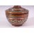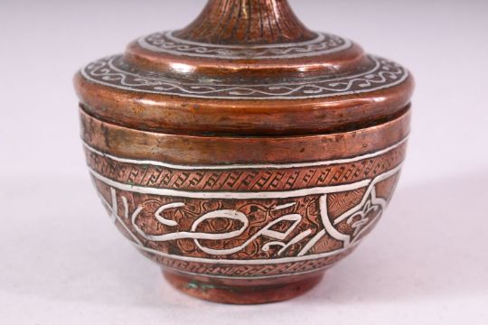AN ISALMIC CIRCULAR COPPER AND SILVER INLAID BOX AND COVER, the cover with brass crescent shaped finial, 9cm diameter.