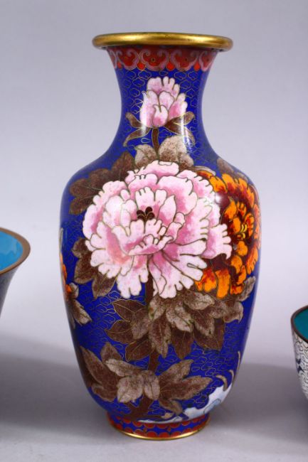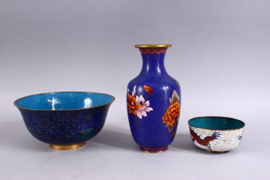 FOUR CHINESE CLOISONNE ITEMS, to include a vase, two bowls and a small dish.