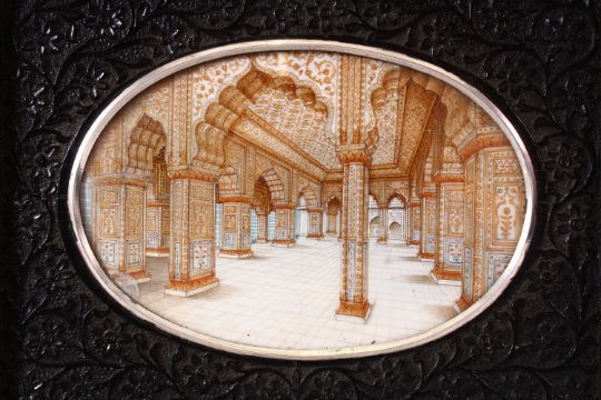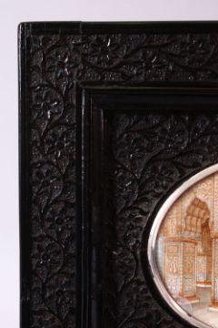 A GOOD LATE 19TH CENTURY INDIAN OVAL MINIATURE PAINTING ON IVORY depicting an architectural interior with gilded highlights in a well carved ebony frame, 25cm wide x 26cm high.
