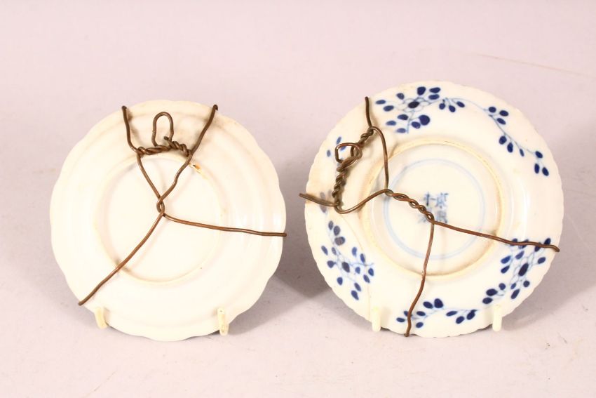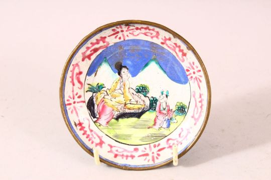 A PAIR OF CHINESE CIRCULAR ENAMEL DISHES painted with figure seated in a landscape, 10.5cm diameter, and two small Chinese blue and white dishes, 10.5cm and 11cm diameter.