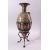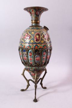 À 19TH CENTURY PERSIAN QAJAR ENAMELLED AND GILT HUQQA BASE AND STAND, decorated with miniature paintings and floral motifs, overall height 35.5cm.