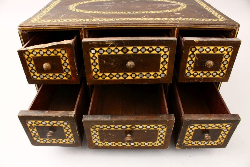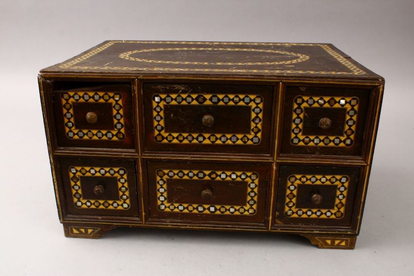 A GOOD 19TH CENTURY INDIAN WOODEN BOX, with six drawers and band of inlaid mother of pearl, 34cm wide x 23cm deep.