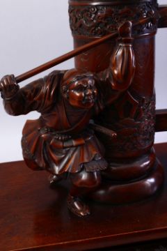 A LARGE GOOD QUALITY JAPANESE MEIJI PERIOD CARVED HARD WOOD OKIMONO - SHOKI & ONI, the okimono carved with the oni upon a carved wooden post, beneath him stands shoki holding a flag, the post carved with lotus and waves, mounted to a rectangular carved apron stand, overall 76cm high x 50cm wide x 31cm deep.