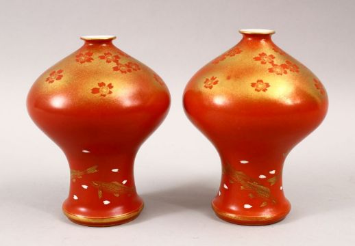 AN UNUSUAL PAIR OF JAPANESE MEIJI PERIOD CORAL RED FUKAGAWA PORCELAIN VASES, the unusual vases with a coral red ground and decorated with scenes of swimming carp and flora, the bases with artist signatures, 14cm high x 11cm wide.