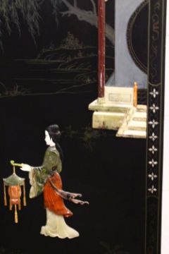 A GOOD 19TH / 20TH CENTURY CHINESE FOUR FOLD HARDSTONE ROOM DIVIDING SCREEN, inlaid with carved hard stones to depict figures and flora, upon a black ground with upper painted calligraphy, the verso simplistically painted with floral and bird decoration, each panel measuring 183cm x 40cm.
