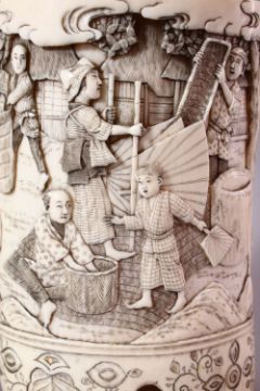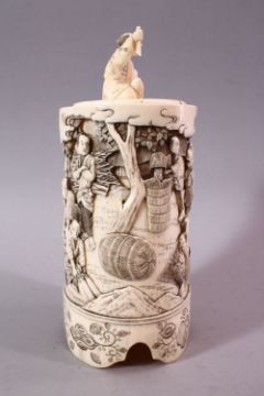 AN EARLY 20TH CENTURY JAPANESE CARVED IVORY TUSK VASE AND COVER, the exterior carved with numerous figures carrying out various pursuits, the cover mounted with a seated male figure, 19cm high.