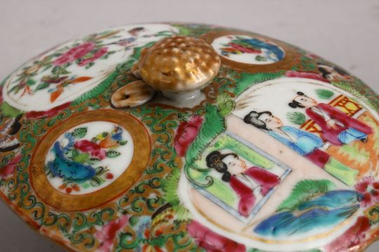 A 19TH CENTURY CHINESE CANTON FAMILLE ROSE PORCELAIN BOX, COVER & TRAY, decorated with panels of figures and birds amongst flora, 9cm high x 15cm wide.