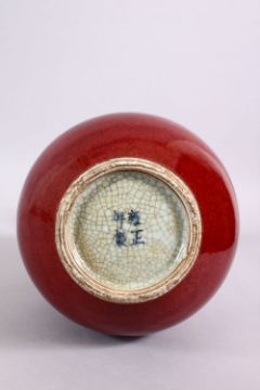 A CHINESE OX BLOOD RED YUHUCHUNPIN PORCELAIN VASE, with a ox blood red ground and a flared rim, the base with a four character mark, 34cm high.
