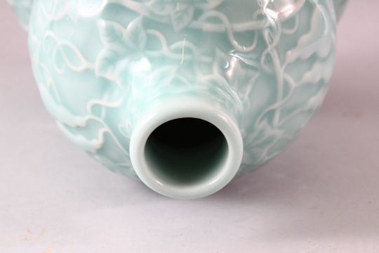A GOOD LARGE CELEDON GLAZED DOUBLE GUARD VASE, incised with fruiting vine, six character mark to base, 34cm.