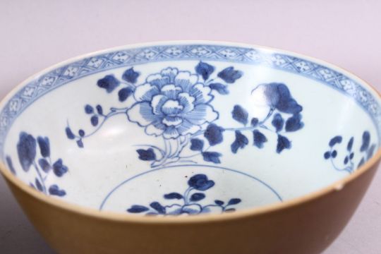 A PAIR OF CHINESE NANKING CARGO SHIPWRECK BOWLS, the interior with blue and white floral decoration, 16.5cm diameter.