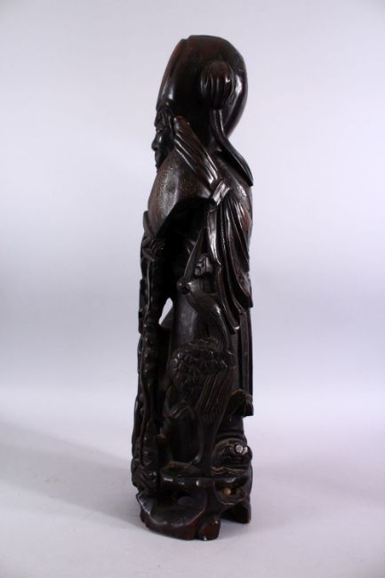 A LARGE 19TH / 20TH CENTURY CHINESE HARDWOOD & SILVER INLAID FIGURE OF SHOU LAO, stood aside deer and cranes, holding his scroll, with carved fruit decoration, with silver inlaid decoration. 64cm high.