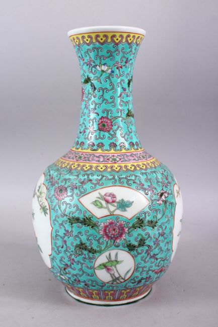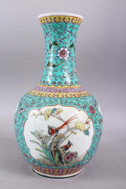 A LARGE 20TH CENTURY CHINESE FAMILLE ROSE BULBOUS SHAPED VASE, painted with panels of birds on flowering branches, 33cm high.