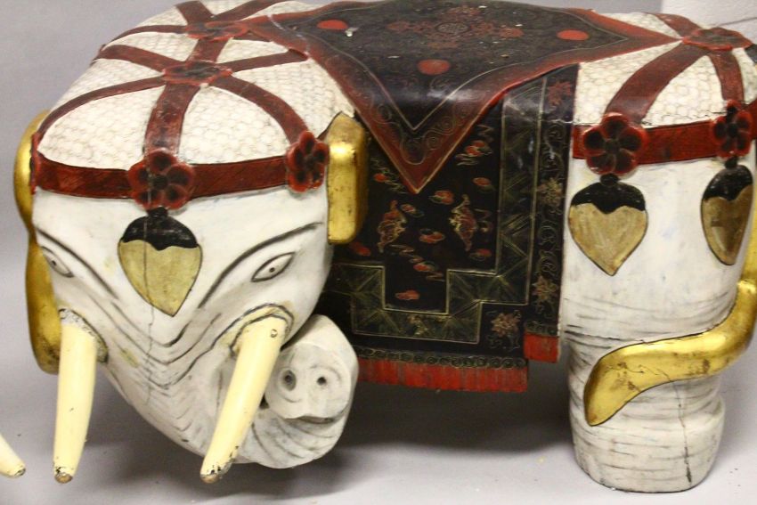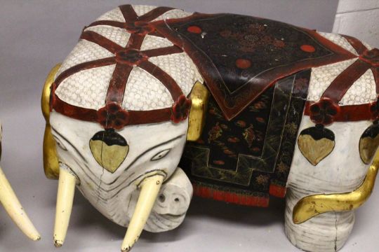 A PAIR OF LARGE 19TH CENTURY CHINESE HARDWOOD DECORATED ELEPHANT FORMED SEATS, The mirrored pair decorated with painted scenes of bats and stylized clouds, and symbols of longevity, the elephants decorated with traditional attire and hanging tassel set, with gilded highlights to the ears and tail, each measuring approx. 58cm high x 94cm wide x 79cm deep.