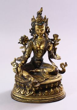 A TIBETAN GILT BRONZE FIGURE OF A SEATED FEMALE DIETY, on lotus pad, 24cm high.