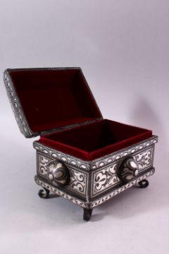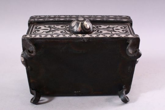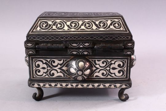 A GOOD 19TH CENTURY SILVER INLAID BIDRI CASKET, with circular bosses to each side, with stylised inlaid silver decoration, 26cm wide, 14cm high, 14cm deep.