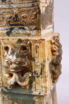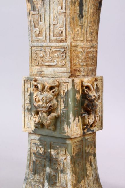 A PAIR OF 19TH / 20TH CENTURY CHINESE ARCHAIC STYLE CARVED JADE VASES, each vase with a central section carved in relief depicting mythical beasts, 36.5cm high x 13.5cm square at top.