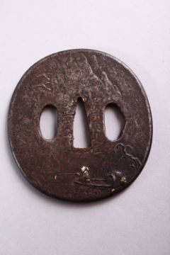TWO 19TH CENTURY JAPANESE CAST IRON TSUBA, each with engraved and inlaid decoration, 7cm and 7.5cm.