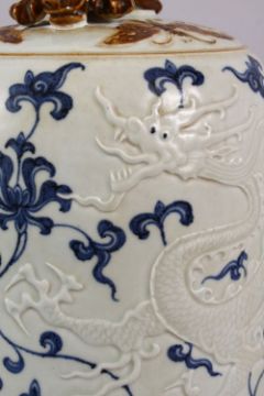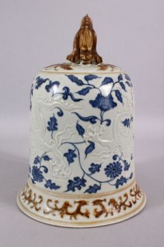 A CHINESE BLUE, WHITE & BISCUIT MING STYLE DRAGON PORCELAIN TEMPLE BELL, the body with moulded relief dragons with blue underglaze lotus decoration, with a biscuit glazed mythical beast handle, 27cm high x 19cm diameter.